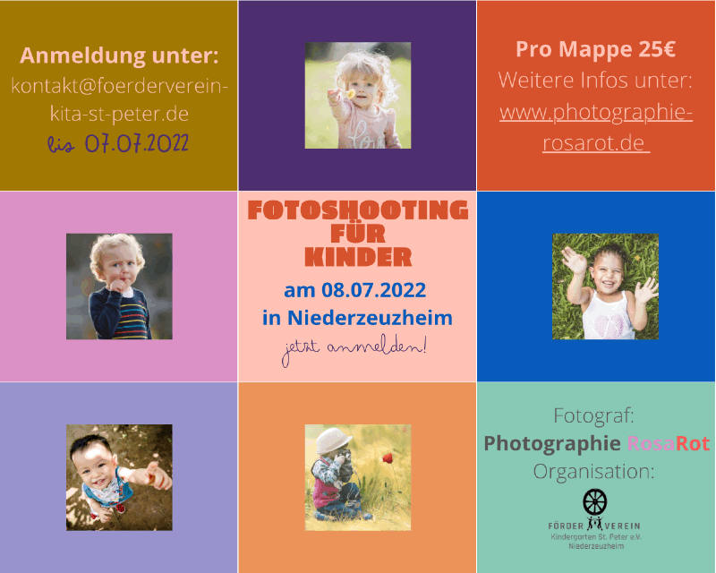 am 08 Juli. Dieses Jahr konnten wir das Studio Photographie RosaRot für unser jährliches Fotoshooting organisieren. Es stehen 2 Fotografinnen für eure Kinder bereit, die die tolle Kulisse am Elbbach an der Brücke Richtung Oberzeuzheim zu nutzen wissen. Anmeldungen gehen bitte bis 07.07. an kontakt@foerderverein-kita-st-peter.de. Wenn ihr euch über die Arbeit und die Konditionen von RosaRot informieren wollt, seht euch gerne auf deren Website um: www.photographie-rosarot.de.